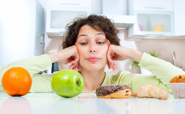 אישה מסתכלת במבט מתוסכל על תפוח ירוק המונח מולה על השולחן, כשלידו מונחים תפוז מצד אחד ושלושה מאפים מצד שני