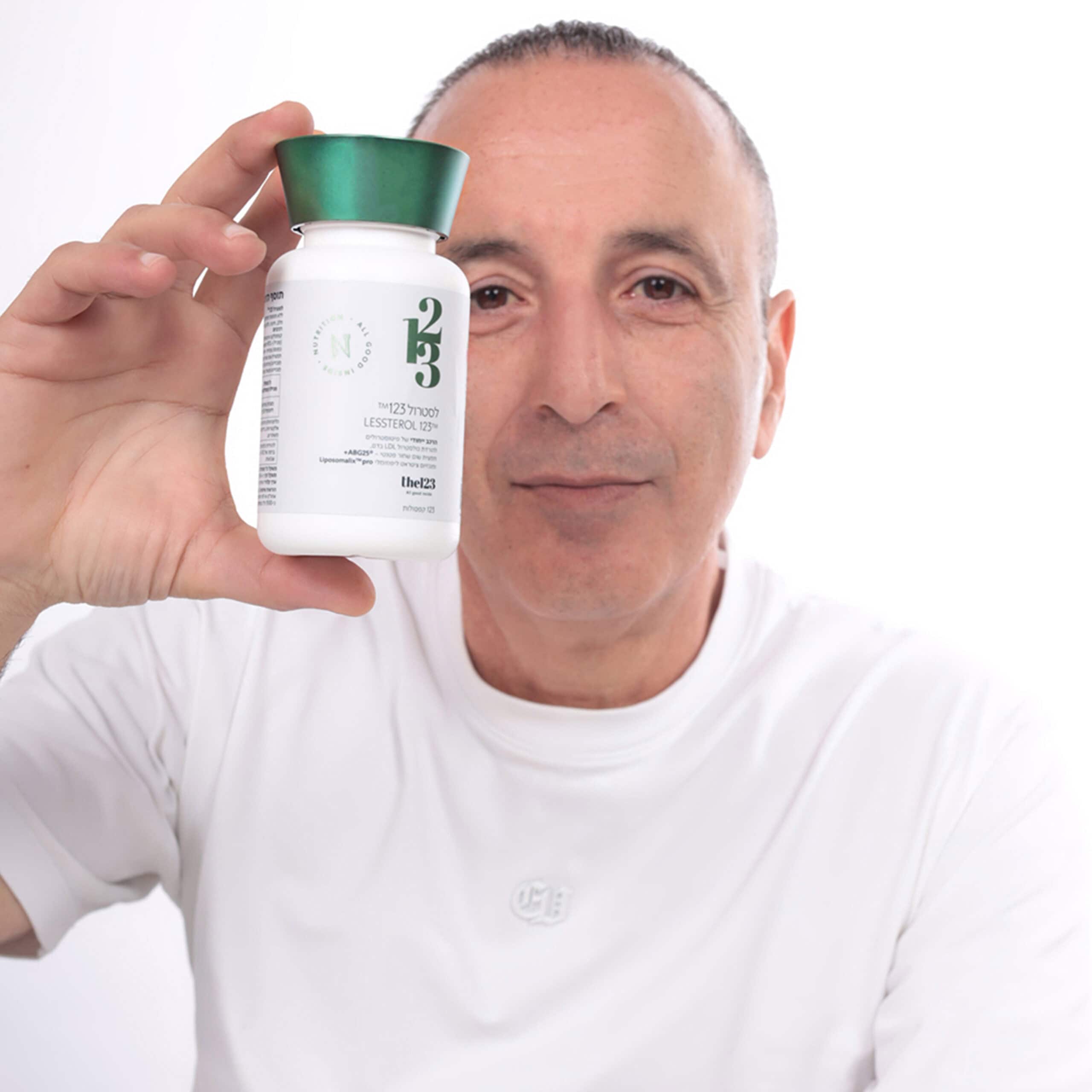 גבר מחזיק בידו בקבוק תוסף לסטרול 123 ומחייך למצלמה