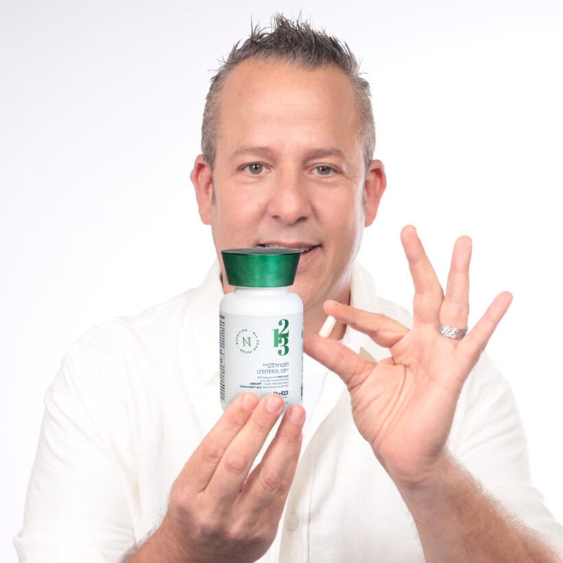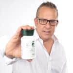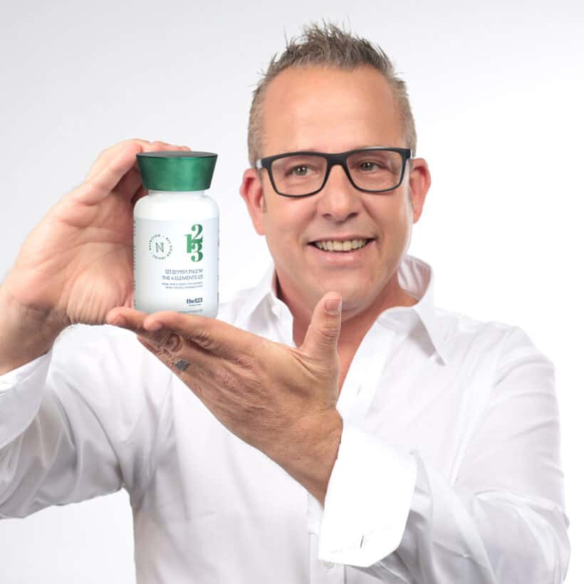 איש בגיל ביניים מחייך למצלמה כאשר הוא מחזיק בידו בקבוק תוסף תזונה מורינגה 123 קפסולות | מיצוי בריכוז 1:10