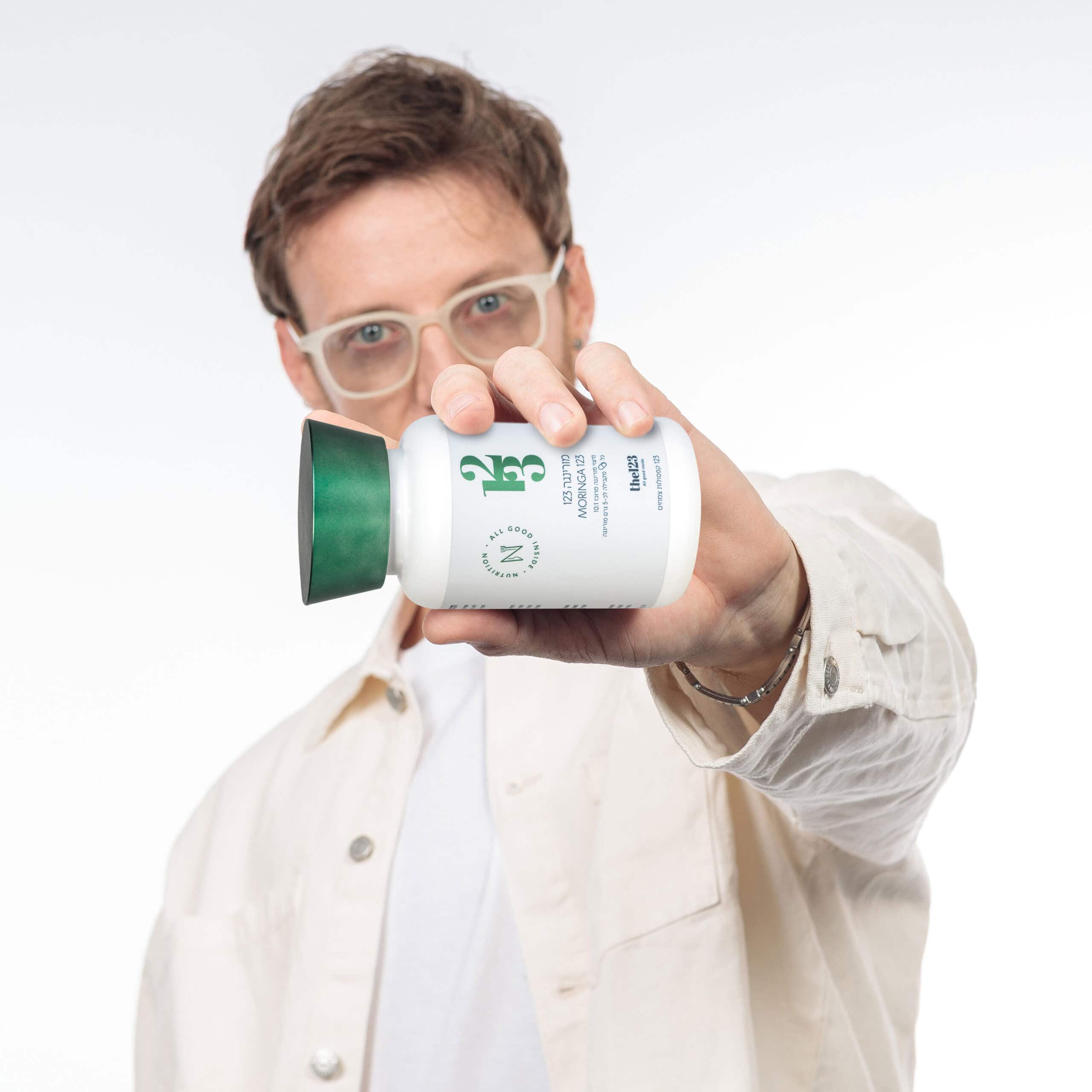 איש צעיר מציג למצלמה בקבוק של תוסף תזונה מורינגה 123 קפסולות | מיצוי בריכוז 1:10