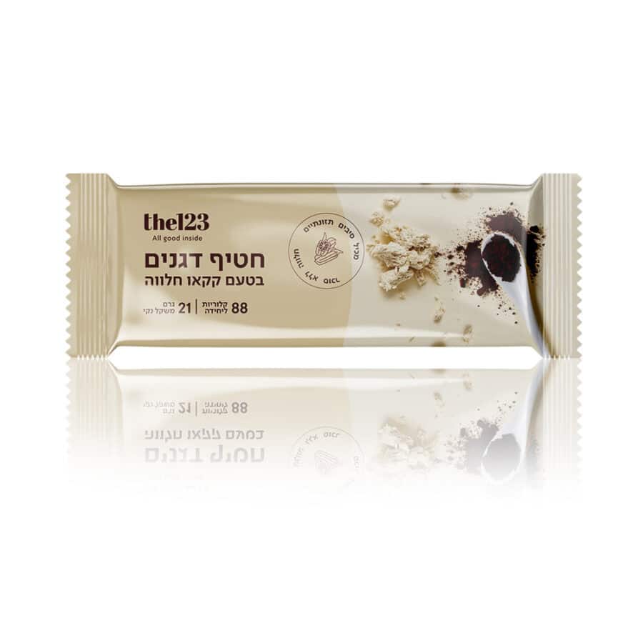 חטיף דגנים בטעם קקאו חלווה נחשק וחלומי מסדרת חטיפי הדגנים של The123 המביאה איתה איכות ובריאות עד 1/2 כפית סוכר לחטיף וללא מדבקה אדומה !