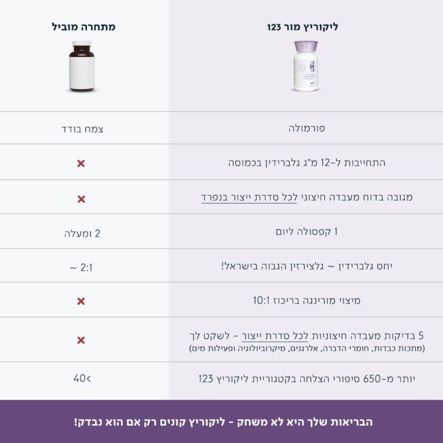 פורמולה איכותית היא כזו שהצליחה למקסם את רמת הגלברידין (12 מ”ג) תוך מזעור הגלציריזין (רמות זניחות). יחס זה, שמוכח בדו”חות שלנו, הוא הגבוה ביותר והוא שמבטא את האיכות והפיתוח הייחודיים של ליקוריץ פלוס 123.