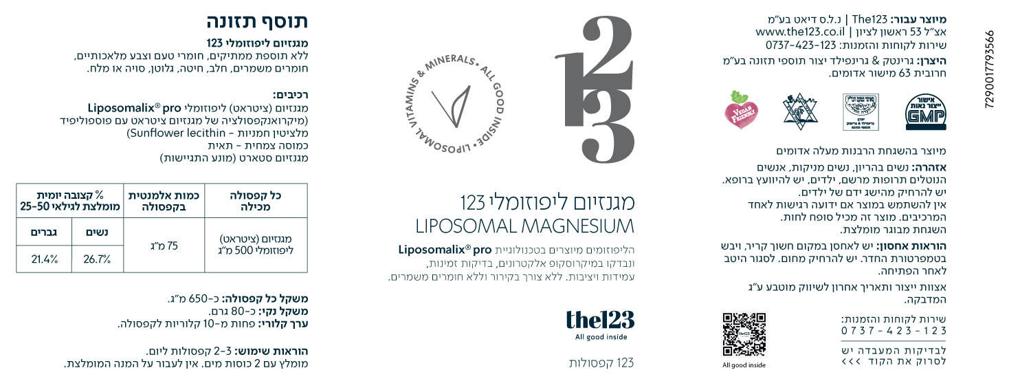 כל קפסולה מכילה 75 מ”ג ערך אלמנטלי נקי של מגנזיום ליפוזומלי. אנו מציינים נתון זה בתווית המוצר.